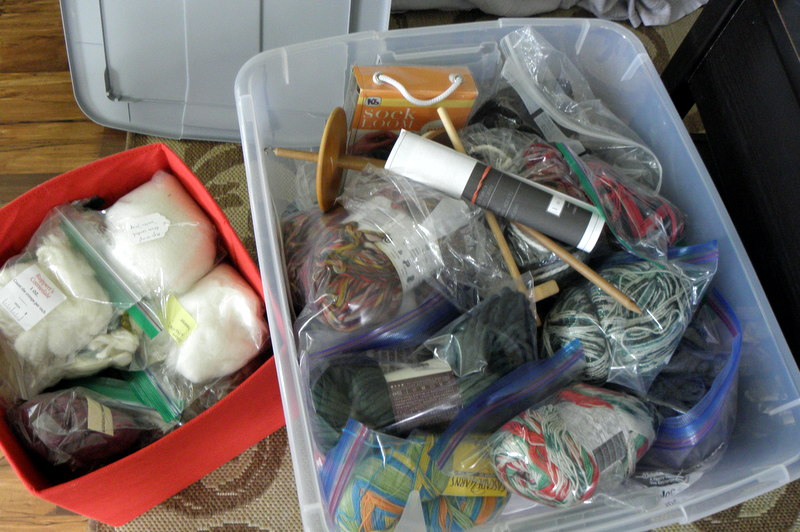 After consulting with my granddaughter, I eliminated a lot of crafty things that she has outgrown: construction paper, glue sticks, markers, googly eyes, etc. We also sorted through jigsaw puzzles and craft kits. (Try as I might, I could not interest her in crafts - too tedious.) And then I hit the fiber stash.